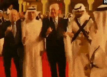说实在的川普为了让沙特人高兴还真别出心裁没少花功夫。比如,居然让泱泱大国美利坚的国务卿,平时看起了永远是一副谁欠了他五百美元一直没还表情的长者蒂勒森,扛着长刀和一大堆穿着大长袍子的沙特王子们跳起了舞(还有另一位穿西装的是商业部长罗斯)。虽然历届美国总统都有到访过沙特,但从来不曾参与/认可其文化活动(does not endorse their culture),总统与高级政要参与此“全男性剑舞”类型的文化活动,在美国外交史上还是头一回。