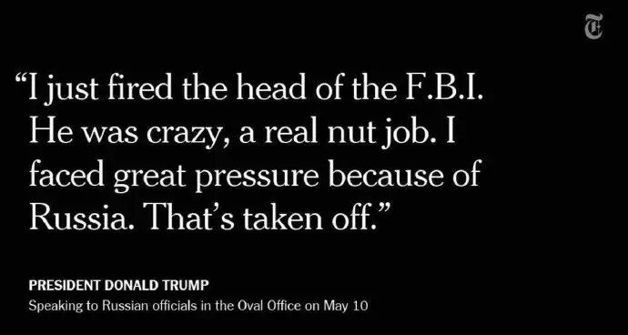“我刚刚炒了FBI局长的鱿鱼。他很疯狂,是个真正的疯子。”还说“因为俄国(这事),我面临了巨大的压力。现在总算解脱了。”