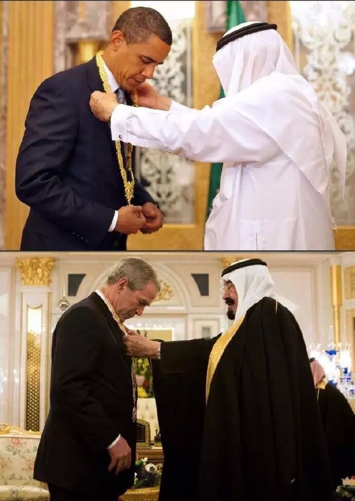 这次作为美国总统的川普访问沙特,接受“最高规格”接待,沙特土豪天团给川普挂上了大金链(阿卜杜拉阿齐兹国王荣誉勋章)。这本身是个外交礼仪而已,除了美国历届总统,普京、特雷莎·梅都曾经被授予过这个勋章。但带这条大金链子,都得弯下腰低个头才能带得上,除非你比沙特国王矮太多弄得像老师给小朋友戴红领巾那样。