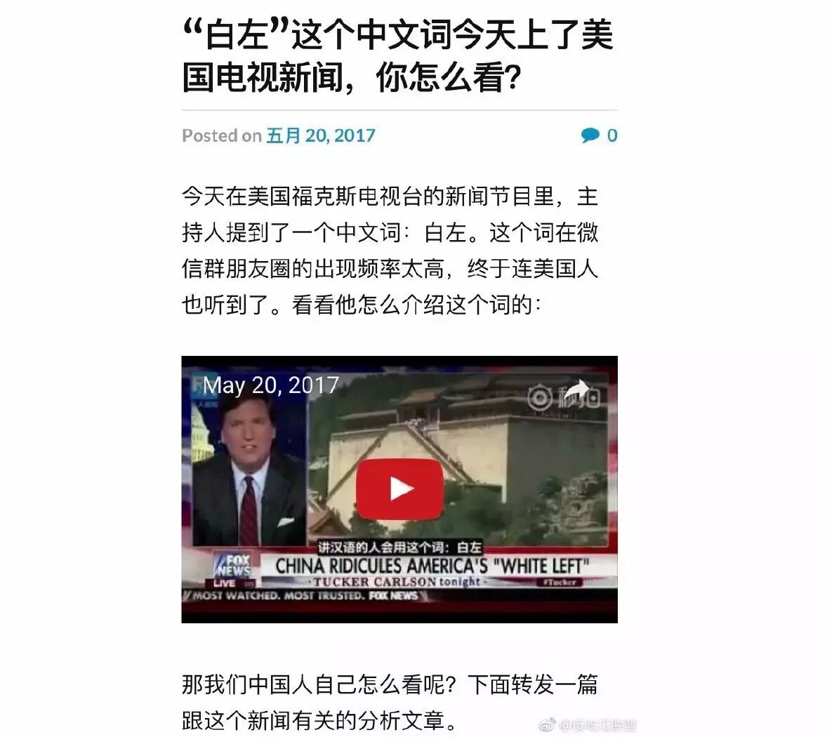 2. 《“白左”这个中文词今天上了美国电视新闻》今天在美国福克斯电视台的新闻节目里,主持人提到了一个中文词:白左。对“白左”一词的解释,其实最早出自一位名叫Zhang Chenchen的作者,她认为这是对左翼/进步主义的侮辱性称呼,是“后社会主义时期野蛮、堕落的实用主义思潮”的产物。 评论文字最后一点有趣的观点:官方对这种民间自发情绪的态度。事实上,官方在近几年的维稳政策,与长期存在的户籍制度,缓慢而混乱的社会改革一起,事实上构成了某种中国保守派乐见的体系。