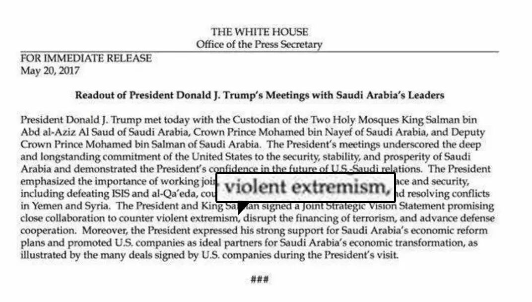 在大选前,川普和其支持者大肆批判民主党搞政治正确,都不敢说“极端穆斯林分子” (radical islamic)这个词,只敢说“极端暴力分子”(violent extremism)?好像说出“极端穆斯林”这个词,极端穆斯林就能立马灰飞烟灭了一样。那这次反极端穆斯林异常坚决的川普去了沙特,一定是要口无遮拦的像唐僧一样重复“极端穆斯林”这个神奇咒语了吧?