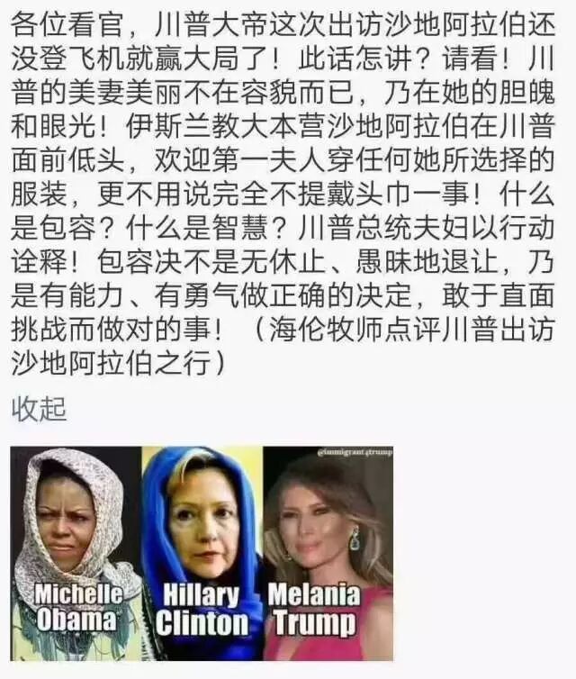 按这说法,之前访问过沙特的米歇尔·奥巴马和希拉里·克林顿都带上了头巾,屈服和默认了沙特伊斯兰教威权对妇女的压迫。而只有川普夫人能够在丈夫的撑腰下摘下头巾,沙特政府震慑于川大统领的浩然正气,对此只能唯唯诺诺,唯命是从。