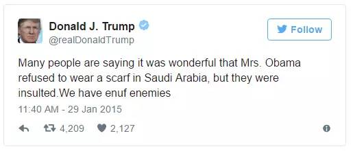 两年前,第一夫人米歇尔奥巴马在沙特访问不带头巾,在美国正是川普本人批评了“不戴头巾”。当时川普发的推特到现在还在: