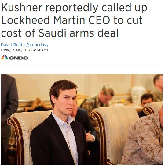 这次访问沙特,还一口气卖给沙特价值高达一千一百亿美元的尖端武器——虽然之前说“沙特资助极端分子”、“主谋9/11”的也是川普。有趣的是,女婿库什纳在和沙特人谈卖武器问题时,当听说客人对高端雷达嫌贵,立马当场亲自打电话给洛克希德马丁公司总裁让她给出优惠价。在场的沙特人都看呆了,纷纷表示:妹想到!