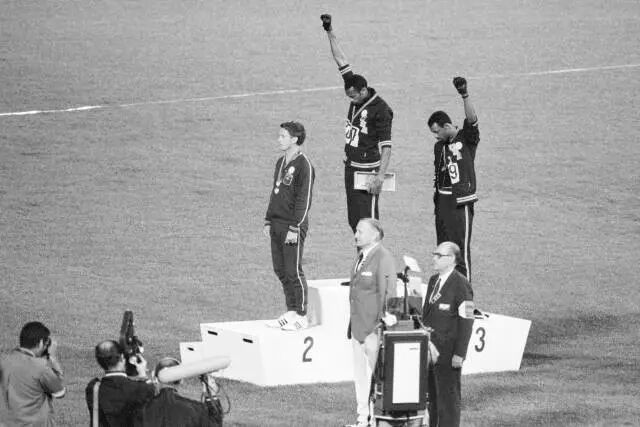 1968年墨西哥城的奥运会,获得200米短跑奖牌的两名非裔美国运动员Tommie Smith和John Carlos在颁奖仪式上作了这样一个动作