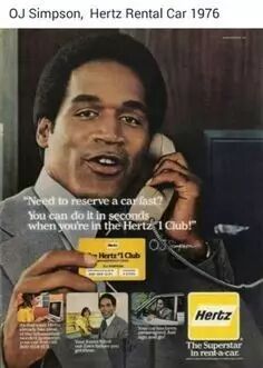 富有市场头脑的美国人立刻发现了辛普森是一位可以化解“人种”矛盾的优秀载体。他出现在广告上时既能得到黑人们的强烈支持,又不会使得白人反感。他火速成为了不少公司的代言人,比如租车公司Hertz、克莱斯勒汽车、新秀丽旅行箱等等,还刷了一遍当年各大广告奖项。