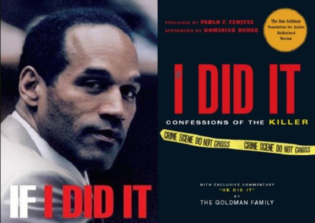 自带光环的辛普森纸醉金迷的生活不够,还出了本书(当然是别人代写的,代写的哥们后来也出来说他认为妮可是辛普森杀的),叫作“If I Did it" (如果我干了)。Goldman的家人听说后大怒,你不仅不还钱还用故人的名字赚钱, 于是起诉获得了该书的版权,索性把“If”中的“f”印得很小,变成了“I did it" (是我干的)。