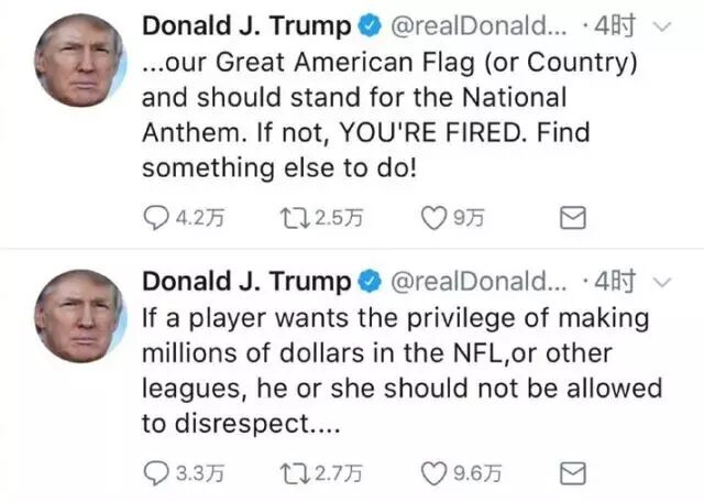 而且,在怼完NBA的球员之后,特朗普干脆还一不做二不休,将枪口又转向美国国家橄榄球联盟(NFL)那个升国旗时没有起立的橄榄球运动员。