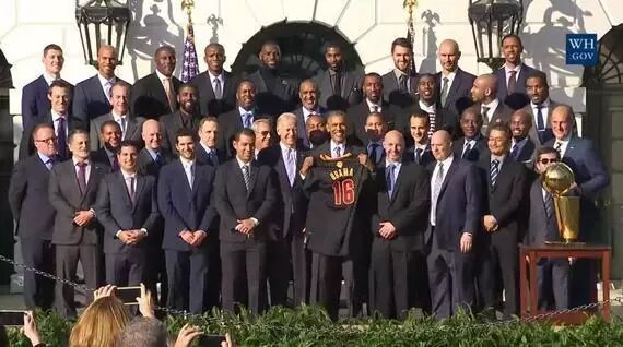 比如去年,NBA著名球星詹姆斯所在的骑士队获得2016年赛季的总冠军,当时的美国总统奥巴马就在白宫接见了全队队员。当时,与娱乐界、体育界关系颇好的奥巴马不仅获赠了印有自己名字的骑士秋球衣,还和球星们互相打趣、谈笑风生。