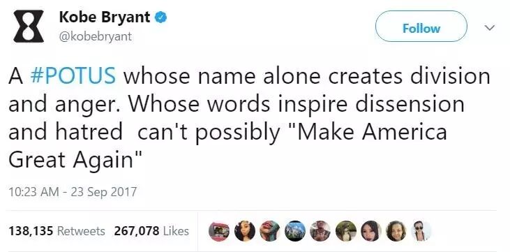 湖人传奇球员科比今天也发推特,怒斥特朗普:“一位总统,单就他的名字本身就已经引起了这么多的分裂和愤怒。一位总是发表激起分歧和仇恨言论的人不可能‘使美国重新变得伟大’。”(同样这条推特也有着惊人的13.8万的转发和26.7万的点赞……)