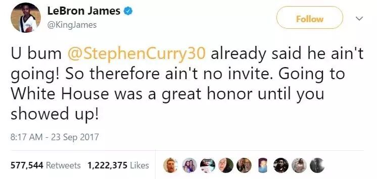 去年的总冠军、骑士队的詹姆斯就发推特嘲讽特朗普说:“库里明明早就说不去了,你还撤哪门子的邀请?受邀造访白宫的确是件充满荣耀的事,直到你出现!”(请注意!这条推特高达57万的转发和122万的点赞!这互动的热度堪比微博“金色九月”的八卦新闻了……)