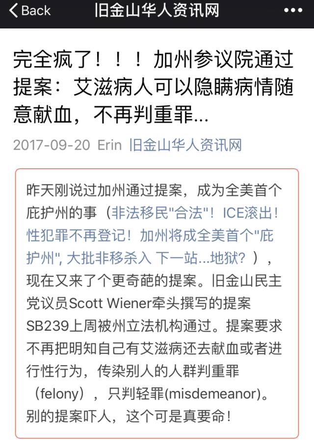“艾滋病人献血”本来就是一个惊恐的话题,竟然还有人要立法让艾滋病人可以肆意传播疾病,文章点击率立马暴增,随即得出结论“加州民主党真是要逼死人啊”。
