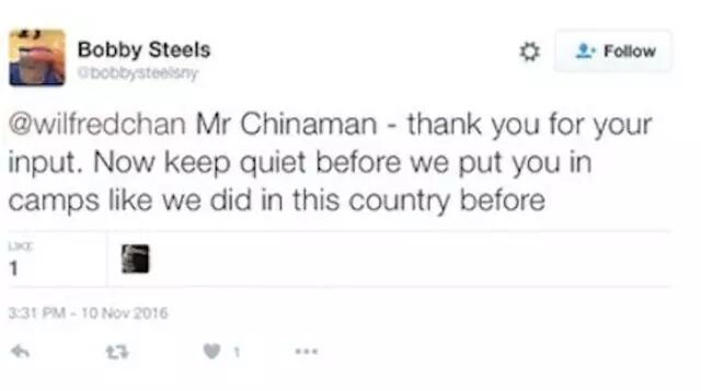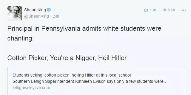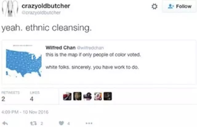 这只是Trump当选后的两天。 歧视会不会演变成更暴力的犯罪hate crime,我不知道。 我知道的是,这是一个总统的价值观对一个社会的影响。(当然您可以反驳,Clinton的价值观也有问题,我在后续会讨论这个问题。)这些人本来存在,但或多或少不会如此猖狂,可竞选的结果给了他们一个一直以来需要的机会去更直白地表现他们对少数群体的歧视。 如果明天的受害者是您或者您的亲人、朋友,您是否还觉得投票给Trump是对的选择? 当年小布什当总统很多人反对,Obama当选很多人反对,可是在他们的执政期间,少数族裔不需要因此而对自己的生命安危担心。 您可能认为您只是喜欢Trump的政策,或者您只是想支持共和党。 可是当您选择了Trump,您同时也为追捧他的那些racists and sexists提供了他们需要的力量。