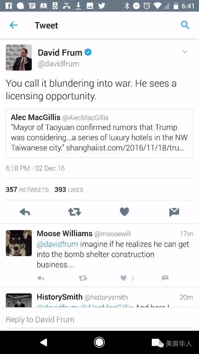 有消息显示川普与台湾通话的目的是为了在台湾拓展他自己的商业帝国。虽然这意味着川普总统与商业帝国的conflict of interest又添一笔,与川普有意针对中国相比,我倒宁愿相信这是他致电蔡英文的真实意图。