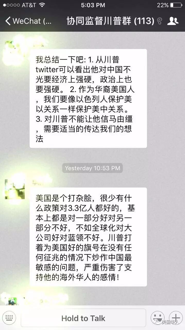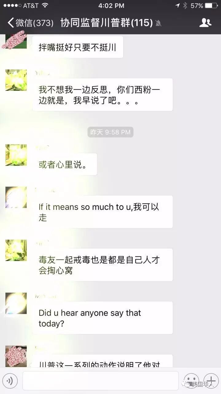 最近就出现了这样一个群,群主是曾经帮川普助选出过很多力的,现在后悔了。从群里一些前川粉的分享来看,川蔡通话预示的中美关系紧张和美国华人安危是后悔的主要原因。
