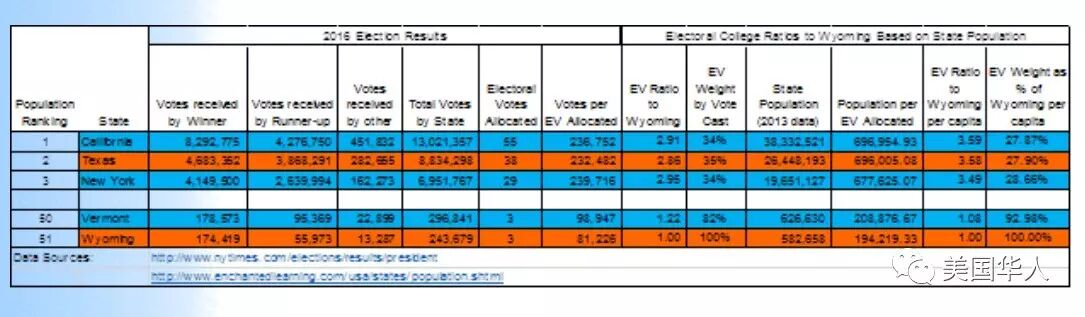 根据2013年的人口样本抽查数据,怀俄明州人口最少,为582,658人,分配了3张选举人票,而笔者所在纽约州人口为19,651,127,分配了29张选举人票。这意味着,怀俄明州只要194,219人就获得一张选举人票,而纽约州则需要多达677,625人才获得一张选举人票。换句话说,在这样的选举人分配机制下,纽约的一个居民的价值只相当于怀俄明州一个居民的28.7%。这个百分比对于加利福尼亚州和德克萨斯州的居民就更加糟糕,只有27.9%(见下表和附录B)。