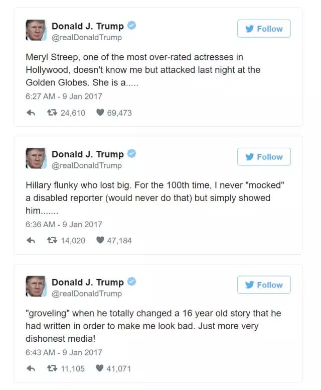 《汉密尔顿》请愿事件仿佛还在昨天,川普如今又沿用了同样的腔调对梅姨的演说跳脚炮轰,连词汇量都不待更新的,说梅姨“over-rated”(还是个错别字),又说梅姨“attack”他。还不忘在此再次强调“我没有模仿嘲讽”,反而是记者“前言不搭后语的要黑我”,继续劳驾各方拼命洗白联系证据。这个颇像我们之前写过川普五个“不为人知”知音体故事的真相中,川普“为了女人而骂女人”的洗白。