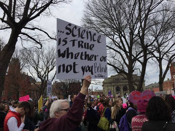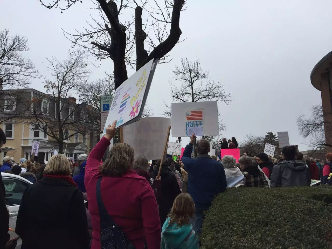 “今天波士顿注册游行人数9万,据一位警察讲,实际到了大约20万,地铁免费(但几乎挤不上,我们三次没挤上,步行半个多小时到,有人五次还没挤上)先集会,演讲,再游行,游行沿途不断有音乐、歌唱,最后有人即兴舞蹈,很多人加入,虽然是抗议,自发组织,但充满理性、秩序、激情、欢乐、友爱、温暖和希望。游行队伍散去,没有一点垃圾,仿佛没有这么多人曾经到此集会游行一样。游行快结束时大家在街头即兴边歌边舞。”--YF