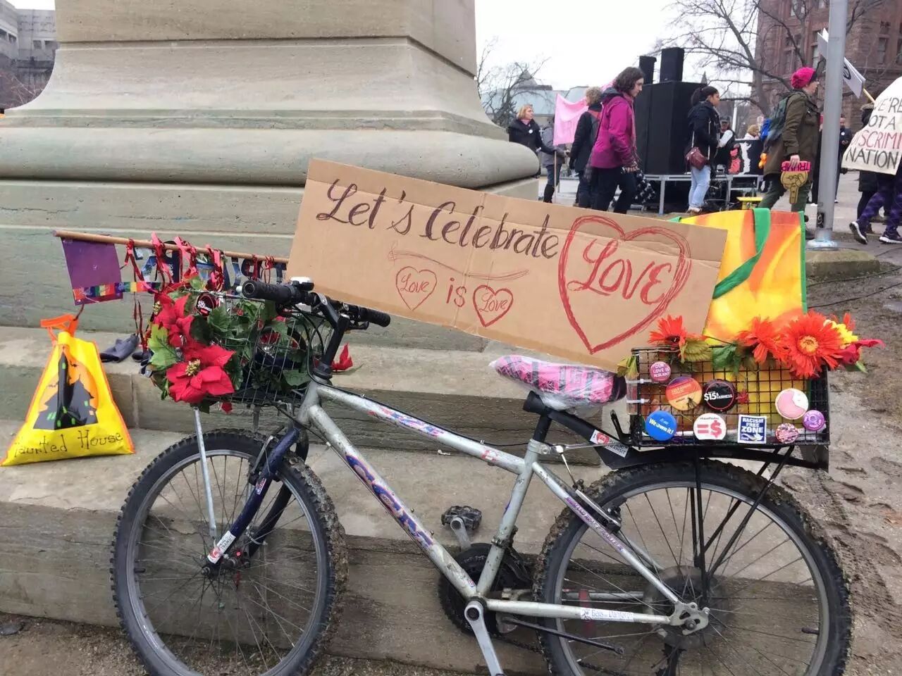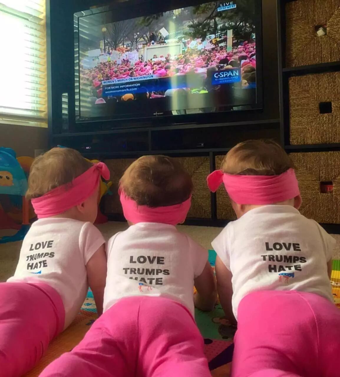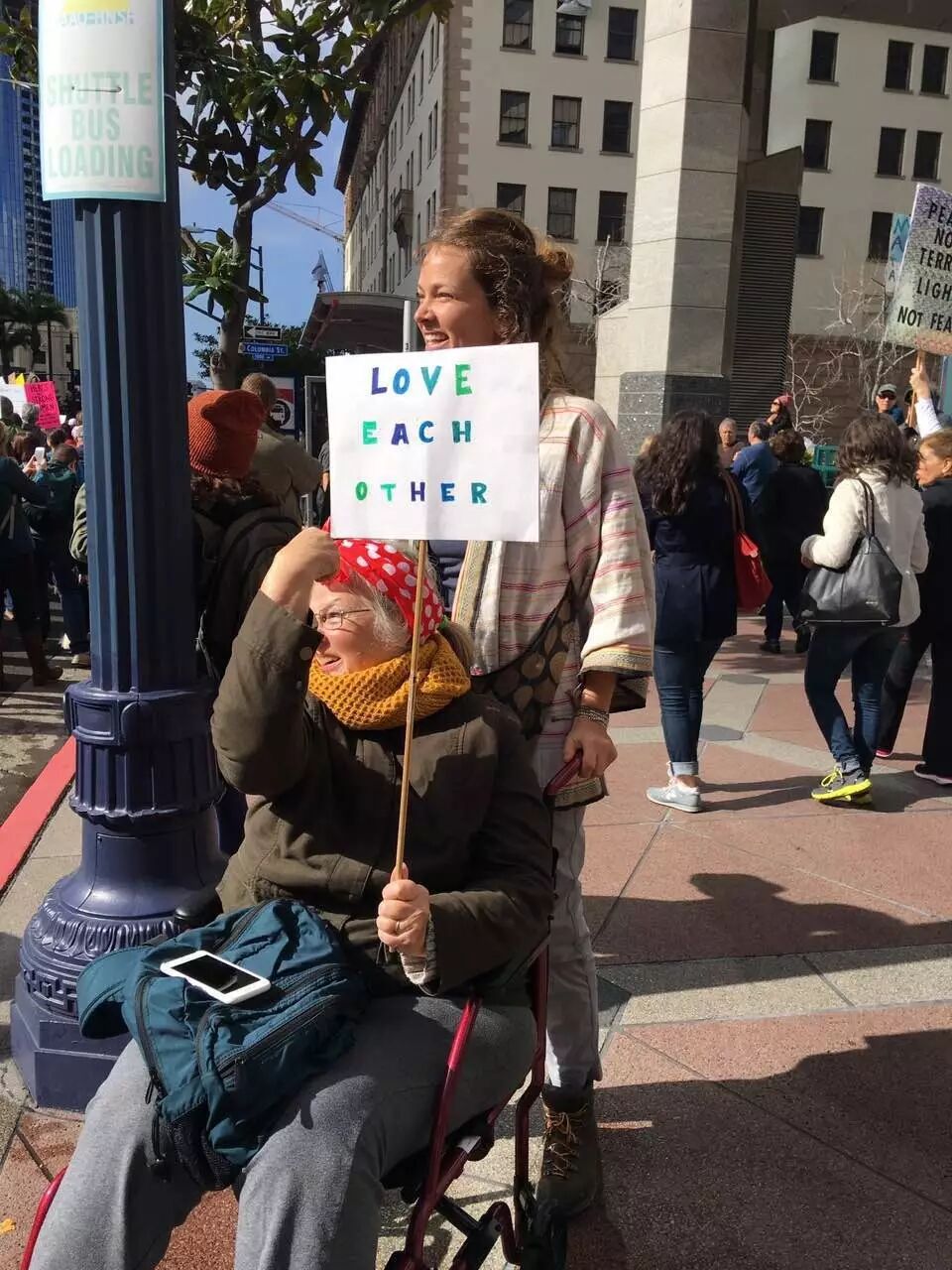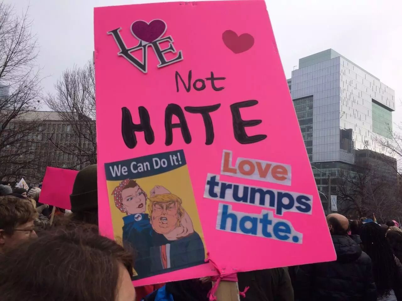 在华盛顿的女性游行聚会上,演员及女权主义者Ashley Judd发表了一段慷慨激昂的抗议演讲《我是一个龌龊女人》。她说,“我的龌龊比不上街头那些玷污了城市的南方联盟旗帜,也许南方会真的再次崛起,也许对有的人来说这些旗帜从没有真正降下……我不知道魔鬼能被招魂,可我确实感到希特勒的幽灵正在大街上游走,只不过一撮小胡子换成了头顶的假发。”这正是许多人的不寒而栗的共识。也正是在爱的召唤下,人们自发地走上街头,在各处的游行参与人数都远超预期,成为有史以来最大的单日集会活动。