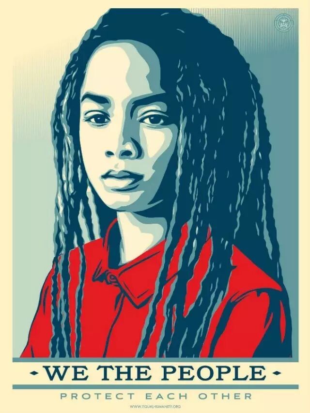 在女性大游行的队伍里出现了包国旗头巾的大幅肖像,就把一些人吓得不轻,还这样解读说:“ 可能想表达好几个意思:(1)美国女性应该和穆斯林女性那样戴头巾。(2)穆斯林女性也爱美国。(3)美国应该朝着穆斯林社会的方向发展。 ”通过上面的分析可以知道,这几条里,只有第二条是对的。其实,该肖像的设计者、著名的街头艺术家Shepard Fairey一共制作了一套三幅招贴,题目是《We The People》,分别来自三个最被歧视偏见所困扰的社群,也正是很多华人不喜欢的三类人:黑、墨、穆。这套招贴画体现的主旨是认同感和平等平权的精神,应当使用的人称代词是“我们”,而不是体现隔阂的“你们”和漠不关心的“他们”。