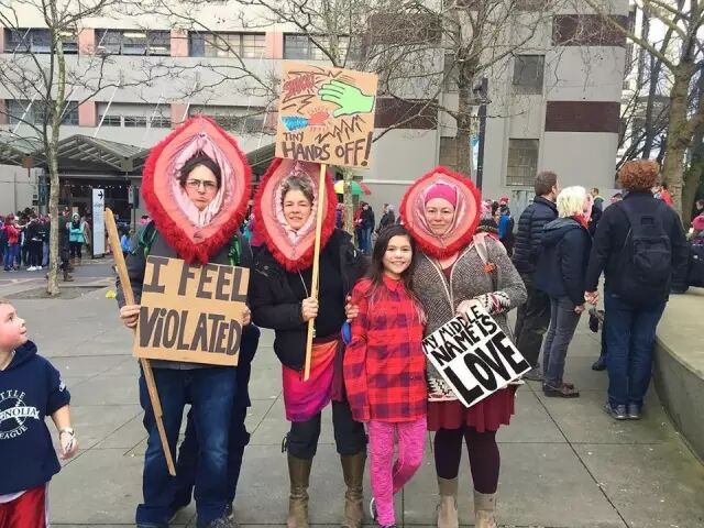 这个争夺话语权的斗争有几个要点。(一)///所谓“更衣室谈话”就是淡化性骚扰的严重性,把不正常变为正常///,所谓“男人都那样”是对男性的不实指摘,而且剥夺了女性的叙事权,完全忽略女性的主观感受和故事经历;(二)遗憾的是,在某些人眼里可能女人的价值就是花瓶,///女人成了行走的性器官///,所以有些女性把自己装扮成女阴的样子,这个行为艺术一方面是为了Pussy代言,一方面也是为了让那些人直面自己的心理投射,从而有所反省;(三)///身体是无罪的,肮脏的是人的思想///,对女性性器官的贬损污蔑是自古以来男权社会遗留的恶习,女人曾经被认为神圣的、神秘的地方,被强行规定为肮脏的、邪恶的,如果男人从不认为自己的下体肮脏邪恶,又有什么理由认为女人呢?(四)女人的///身体属于自己,想做什么由自己决定///,凭什么男人连自己的下体都管不好,却管起别人的下体、甚至胸部和大腿来了?这包括什么可以露,什么必须藏,什么可以放进去,什么可以拿出来,什么又死活不准拿出来……总之,你看的那些所谓“限制级”,是一些严谨的控诉。“Pussy Grabs Back”的含义是,一直被压抑、被污名、被侵犯的“猫猫”,要为了自己的权利反抗!那些头戴粉红帽的男士,正是表达了自己最可贵的支持。所以我们可以乐观地说,这次大游行开启了男性反击男权思维的历史性新阶段。