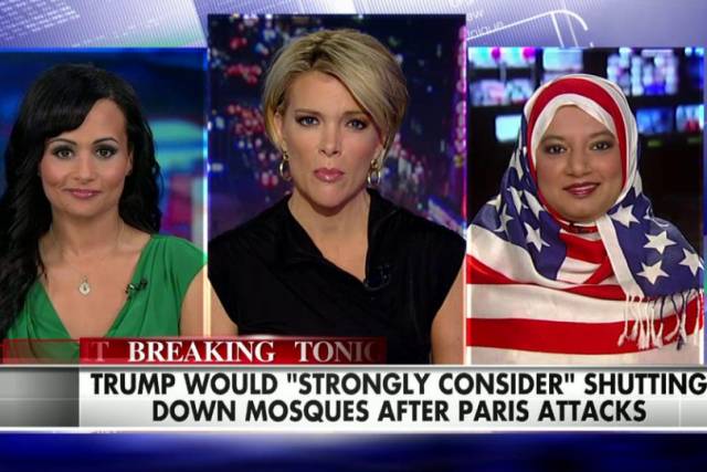 2015年11月,巴黎发生了震惊世人的恐怖袭击,当时正在跑竞选的川普声称,伊斯兰教就是问题根源,要解决问题就要关闭清真寺。俗话说,一竿子打翻一船人,就是这个意思。偏右的电视台Fox播出了一期《The Kelly Files》政论节目,由当红主播Megyn Kelly连线采访了两个相关人物,一个是川普竞选团队的发言人Katrina Pierson,一个是同属共和党的穆斯林联合会主席Saba Ahmed,希望双方沟通一个问题:关闭清真寺是否符合宪法,以及这样做是不是一个明智的反恐举措。