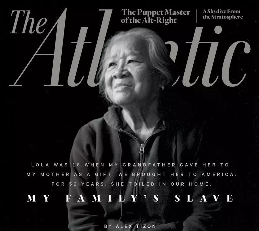 《大西洋月刊》2017年6月号的封面文章是《洛拉:我家的奴隶》(My Family’s Slave),作者是阿列克斯·提臧(Alex Tizon)。他于今年三月去世,他是普利策获奖记者及《大小人:寻找我作为亚洲人的自己》(Big Little Man: In Search of My Asian Self)一书作者。