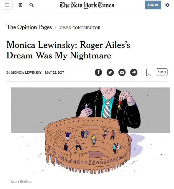 前几天,这位Roger Ailes死掉了,莱温斯基在《纽约时报》撰文,痛陈这个Fox News电视台的发家美梦是自己多年的噩梦,希望看到的不是Ailes的讣告,而是整个强奸文化的讣告。Fox News执行总编John Moody曾经声称,“莱温斯基是我们的美梦成真”,她的人生、性格、外貌和身体都成了摇钱树被无情勒索。她被叫做婊子、贱货等各种难听的名词,甚至还这样对观众提问:“你认为莱温斯基是一个平常人家的女孩还是一个找刺激的小骚货?”