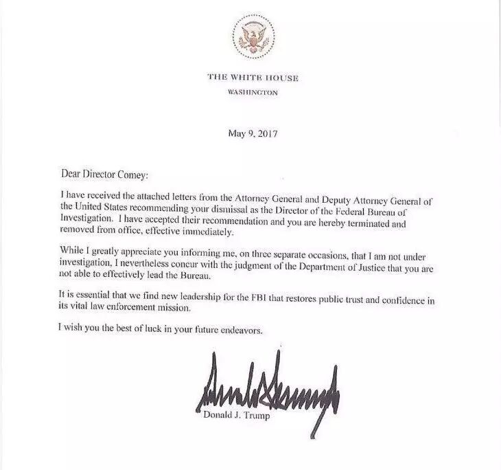 I have received the attached letters from the Attorney General and Deputy Attorney General of the United States recommending your dismissal as the Director of the Federal Bureau of Investigation. I have accepted their recommendation and you are hereby terminated and removed from office, effective immediately.
