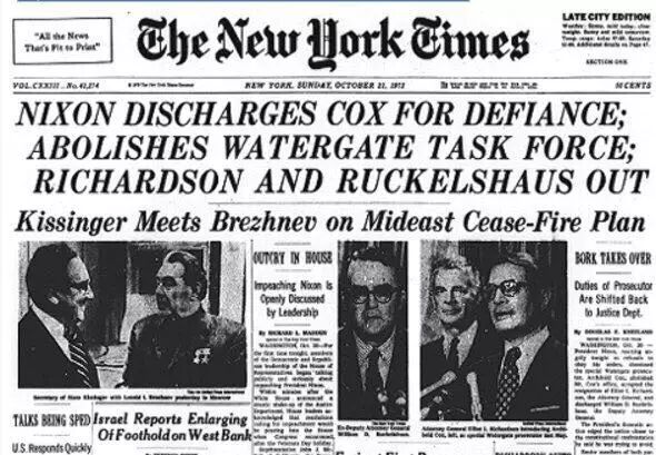 1972年10月20日,星期六,尼克松要求当时的Attorney General Elliot Richardson 叫Cox 走人。Richardson 拒绝这样做,以辞职抗议。尼克松接着要求Deputy Attorney General William Ruckelshaus 做Richardson 拒绝做的事,结果Ruckelshaus 同样拒绝,并同样以辞职抗议。最后是Solicitor General Robert Bork 没有顶住压力,违心地把Cox 弄了下去,但这一系列的政治风暴导致了尼克松更快地下台。