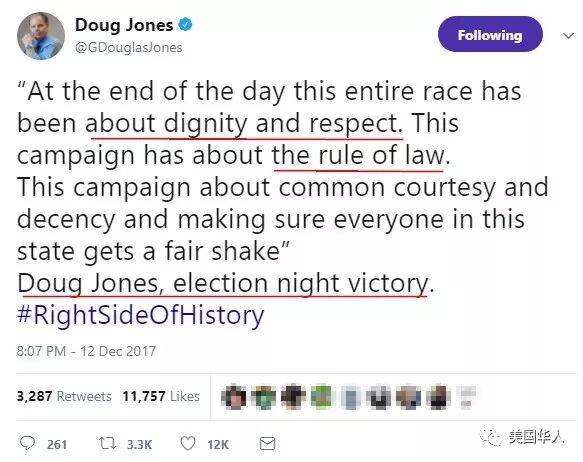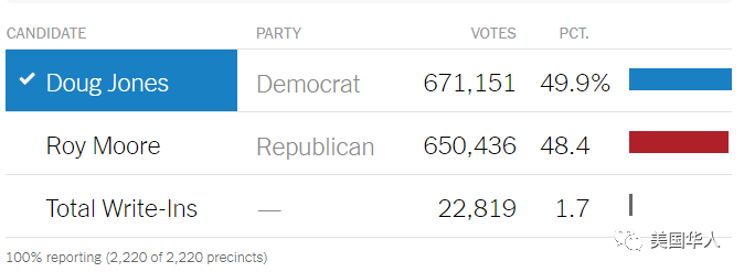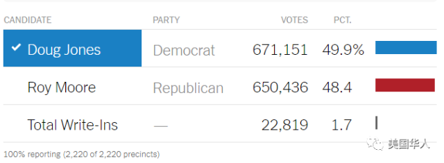 12月12日,尘埃落定,民主党参议员候选人琼斯,以2.1万选票、即1.5%的优势,击败共和党人摩尔,宣告胜利!