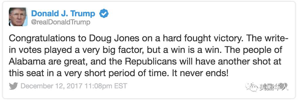 尽管12日晚,摩尔不承认败选,要求重新点票(不过法律规定,赢率超过0.5%就不能要求重新点票)。但川普总统和阿拉巴马共和党已经承认琼斯胜选。川普在第一时间送达对琼斯的祝贺:“不折不扣的一场胜利(A win is a win)!"