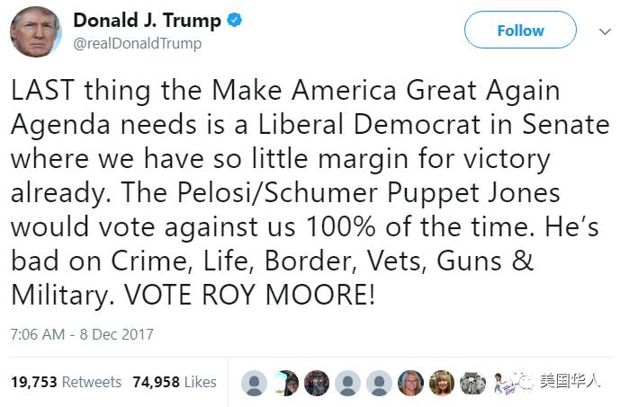 川普在对Moore的态度上一波三折(点击链接),不过12月4日进入正式全面背书,成为最努力的啦啦队队长。给出支持者们的理由是,必须且只能支持共和党的参议员候选人!这种选党不选人的“任性”,背后是对深红区选举的志在必得。