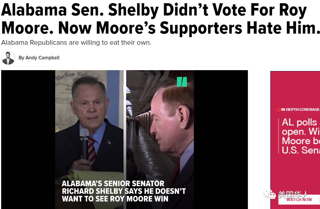 阿拉巴马共和党参议员Richard Shelby则说:"我不能选 Roy Moore,不希望看到Moore赢得周二的选举。” 值得一提的是,Shelby议员最早于1986年以民主党注册身份当选,后来,他变到共和党。从此,阿拉巴马州参议员竞争历史中没有出现过任何一位成功当选的民主党人。直到昨天。