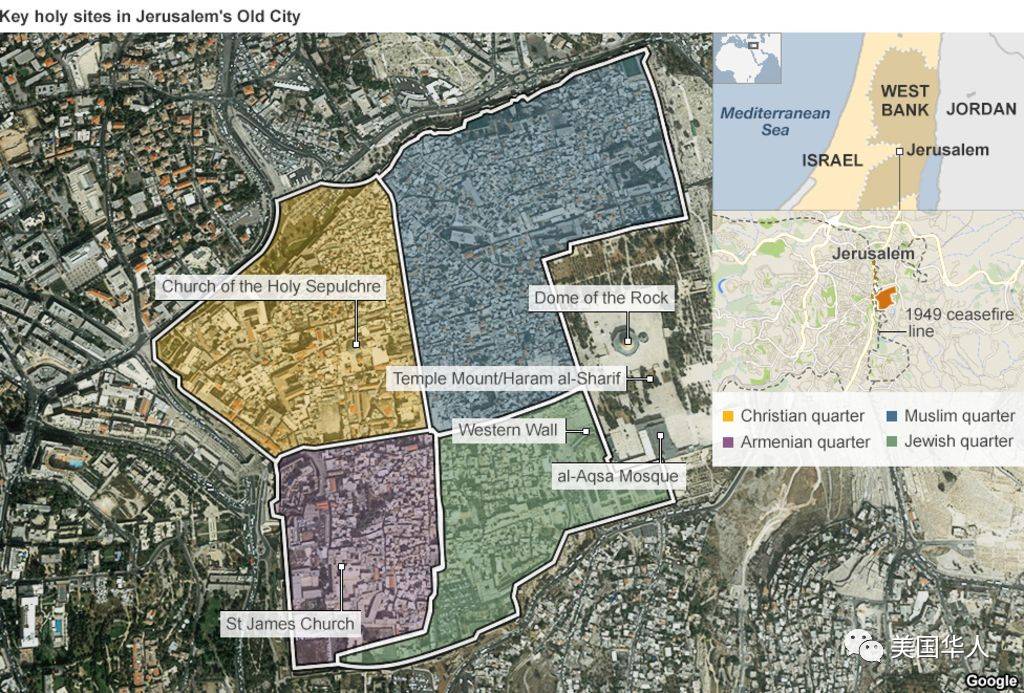 圆顶清真寺(黄色)以及穆斯林区(蓝色)、基督徒区(黄色)、犹太人区(绿色)、亚美尼亚区(紫色)(Credit:BBC)