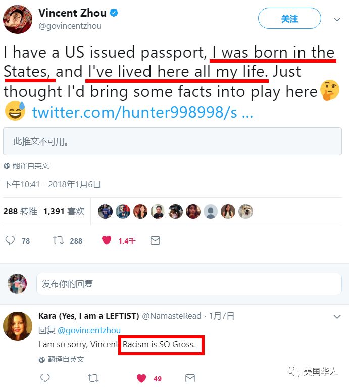 体育界,以前我们熟知林书豪面对种族语言的各种反驳和机智周旋。而最近,刚刚拿到美国男子花样滑冰冬奥会入场券的华裔少年Vincent Zhou,在推特上反驳歧视他的种族分子,得到大量支持和声援: