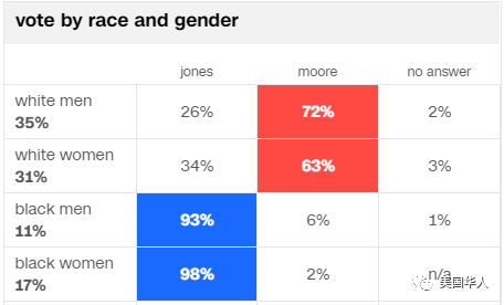 这是本号留言最积极的一位读者最近的一次评论,第三、四句有道理。第一、二句这种类似的说辞在中文世界屡见不鲜,我们来看看这种认识到底跟事实是否匹配。这是最近新泽西、弗吉尼亚、阿拉巴马几个地方选举,出口民调结果的统计。