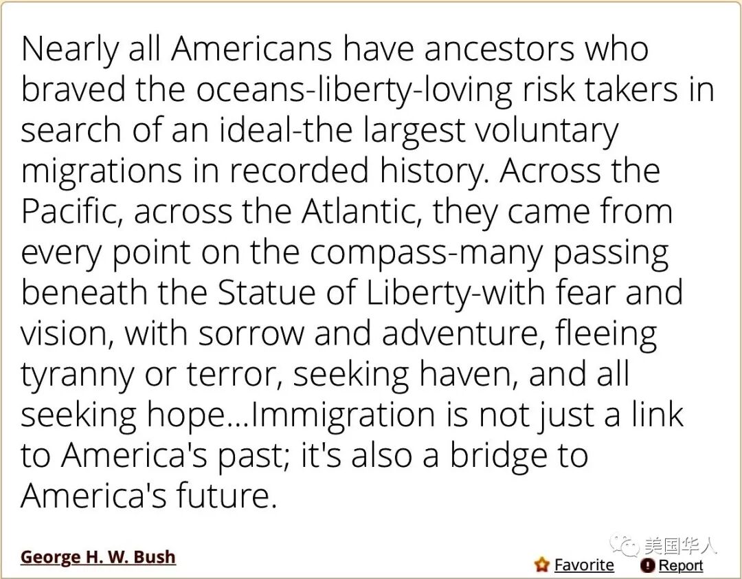 “几乎所有美国人的祖先,都是热爱自由,敢于冒险,无惧惊涛骇浪,漂洋过海地追求一个理想的人,他们构成了有史以来最大的自愿迁徙。横跨太平洋,穿越大西洋,他们来自尘世罗盘上的每一个角落。其中许多人从自由女神像下经过,带着恐惧和愿景,悲伤和冒险,逃离暴政或恐怖,寻求避难,寻求希望......移民不仅是了解美国历史的一个纽带,也是通往美国未来的桥梁。”
