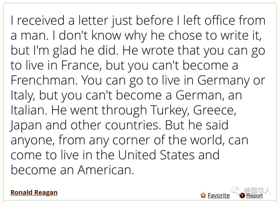 “在我离开白宫之前,我收到一个人的来信。我不知道他为什么决定写它,但我很高兴他这样做了。他写道,你可以去法国住,但是你不能成为法国人。你可以去德国或意大利生活,但是你不能成为德国人,意大利人。他继续列举了土耳其,希腊,日本和其它类似国家。但他说,世界上任何一个角落的人都可以来美国生活,同时也成为美国人。”