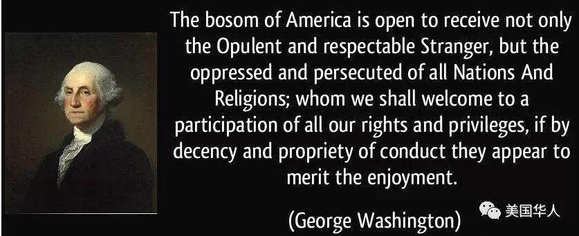 “美国的胸怀不仅拥抱那些华丽高贵的陌生人,而且也欢迎来自所有国家和宗教的被压迫和被迫害的受难者。如果他们心性善良品行正当,我们理所当然应该欢迎他们来到这个新的国度,加入我们的行列,拥有一样的权利和特权。”