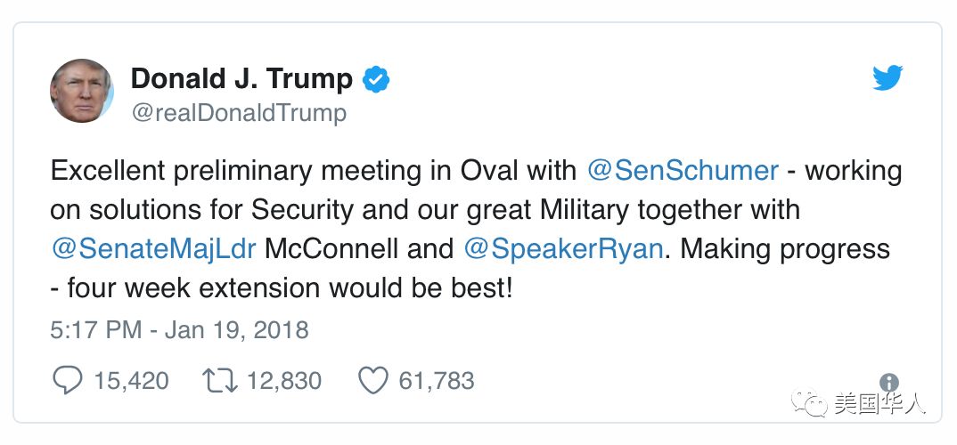 特朗普总统2018年1月19日的推文,当时他对两党能够达成协议抱有极大信心。