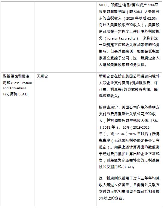 新税法鼓励美国公司的对外出口和技术输出,通过“境外无形收入”(FDII)这一新规定对美国企业的出口收入给予税收优惠。“境外无形收入”简单来说是指美国企业向境外销售货物、提供服务或技术而获得超过“有形资产“10%回报率的超额利润。按照新规定,该收入的37.5%免征所得税,相当于享受13.125%的有效税率。2026年以后免征额度会下调到21.875% ,相当于有效税率16.4%。这将有利于提高美国企业的出口优势,特别是技术、服务产业以及不需要很高固定资产投入的产业将从这一优惠中受益。并且这一税收优惠适用于所有美国境内企业,包括外国公司、投资人在美国设立的企业。对于关联企业之间的交易,FDII的适用可能会受到限制。