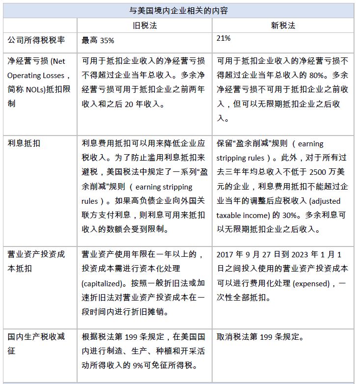 总体来说,此次税改旨在刺激美国国内经济发展、增强美国企业竞争力,对美国境内注册的企业的“利好”消息包括:(1) 通过降低税率减轻美国境内注册的企业运营负担;(2) 对境内企业出口收入(FDII)给予税收优惠待遇;(3) 境外利润汇回免税,鼓励海外资金回流;(4) 通过投资成本加速抵扣,鼓励设施更新和再投资等。但另一方面,由于减税所带来的巨大财政赤字压力,新税法对原有的一些税收优惠政策也进行了削减或废除(例如国内生产减征),扩大了税基(例如对受控外国子公司(CFC)的全球无形低税收入(GILTI)进行征税、净经营亏损抵扣限制等),并对跨境投资中一些常用的带有避税性质的作法加以更严格限制(例如利息抵扣和关联公司之间的费用支付)。在这些因素的综合作用之下,税改对不同行业、不同企业会带来不同影响,其减税效果也很难一概而论。
