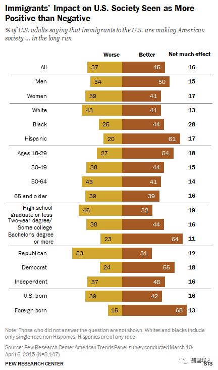 Pew Research移民调查(45%认为移民让社区变得更好,37%认为移民让社区变得更糟,16%认为没有任何影响)。