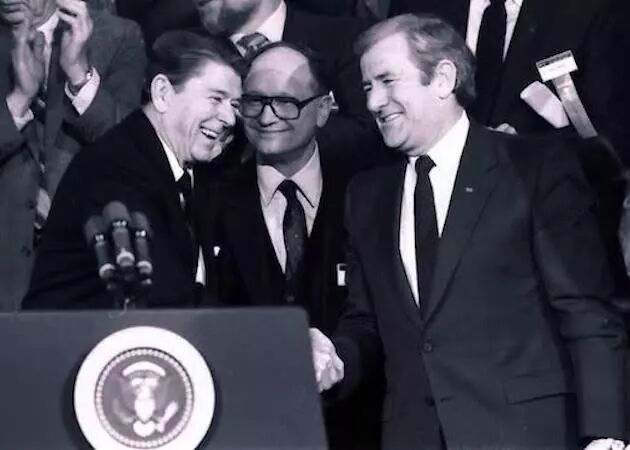 1984年1月3日,在华盛顿的一个全国宗教广播员大会上,里根总统与福音派基督教领袖Jerry Falwell Sr.握手。(AP Photo/Ira Schwarz)