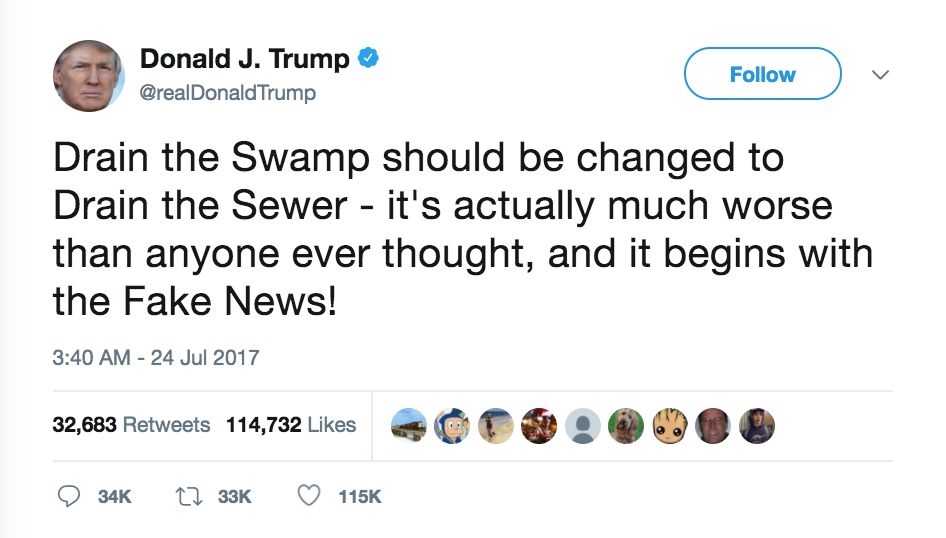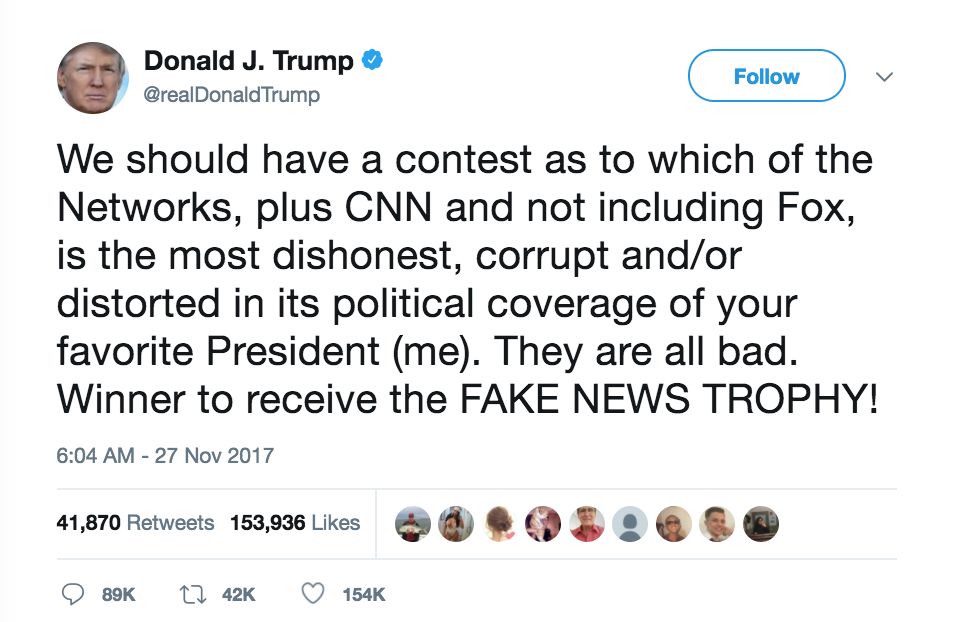 2017年9月其中一天,川普总统8次提到“假新闻”。其用意明显,他希望丑化媒体,期望选民对媒体失去信心,使得媒体不再能有效发挥监督和传达真相的功能。当真新闻被认为是假新闻,而被有心人制造的谎言却被认为是真新闻的时候,独裁者就可以为所欲为了。