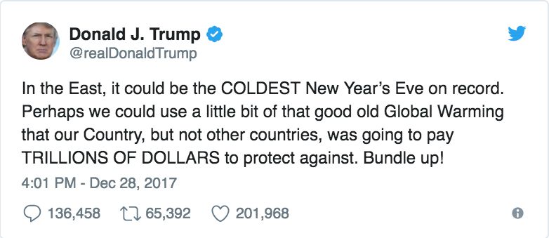川普否认“全球暖化”的方式也是利用谎言。他技巧地把“气候”改变为“气温”。他说:气温可以上升,可以下降,所谓“暖化”根本不存在。他最近又说:今年冬天多冷,哪有什么暖化?就这样,所有科学家对“气候”的研究在他眼中就都变成无谓。