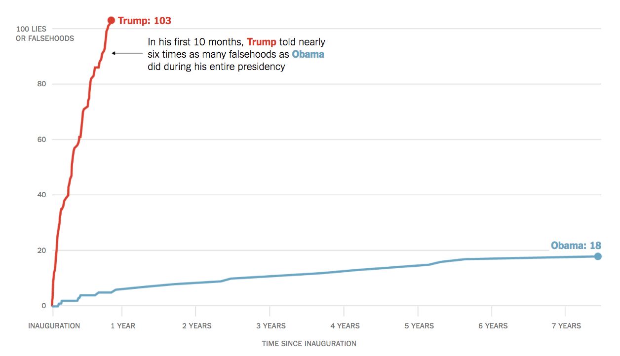 《纽约时报》2017年12月14日公布,川普上任十个月以来重复所说明显的谎言有103个(部分谎言不计)。奥巴马在位八年,总共说了18次谎言。《纽约时报》并且把川普从上位到12月14日,以及奥巴马八年所有的谎言都列表对照。