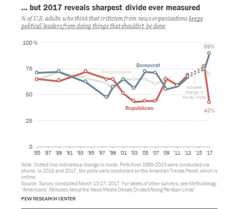 同一民调发现,针对“新闻媒体的批评是否可以防止政治领袖做不该做的事”这个问题,观点在2017年趋向两极化。共和党选民只有42%认为新闻媒体有这样的功能,民主党选民则高达89%这样认为,无党派人士大约有70%如此认为。新闻媒体通常不会突变,这个两极化显然是选民受到政治景观的刺激(领导者煽动?)。