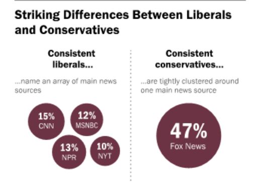 皮尤2014年的一个民调显示,越是保守的人,越集中观看同一个新闻电视台。如上图,持续保守的人有47%只收看福克斯新闻(Fox News),持续自由派的人的新闻吸收面则比较宽广。